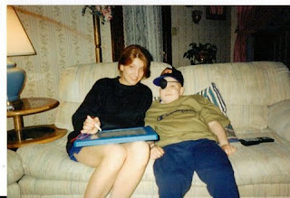 A wheelchair ramp was built from our front step all the way down almost to the busy street in front of our house. We'd get Stephen outside for short periods, and take him for walks around the neighborhood. On one occasion, a good, kind friend of mine brought over Joe, his Great Dane, to "walk" Stephen. Stephen held onto the leash, and grinned his one-sided grin as Joe pulled his wheelchair over the bumps in the sidewalk. He'd never seen such a huge dog, and Joe was so friendly. He'd lay his head in Stephen's lap, and let him scratch him around the ears. But Stephen was getting heavier, and tired easily even just sitting up, so these outings were getting shorter, and harder.